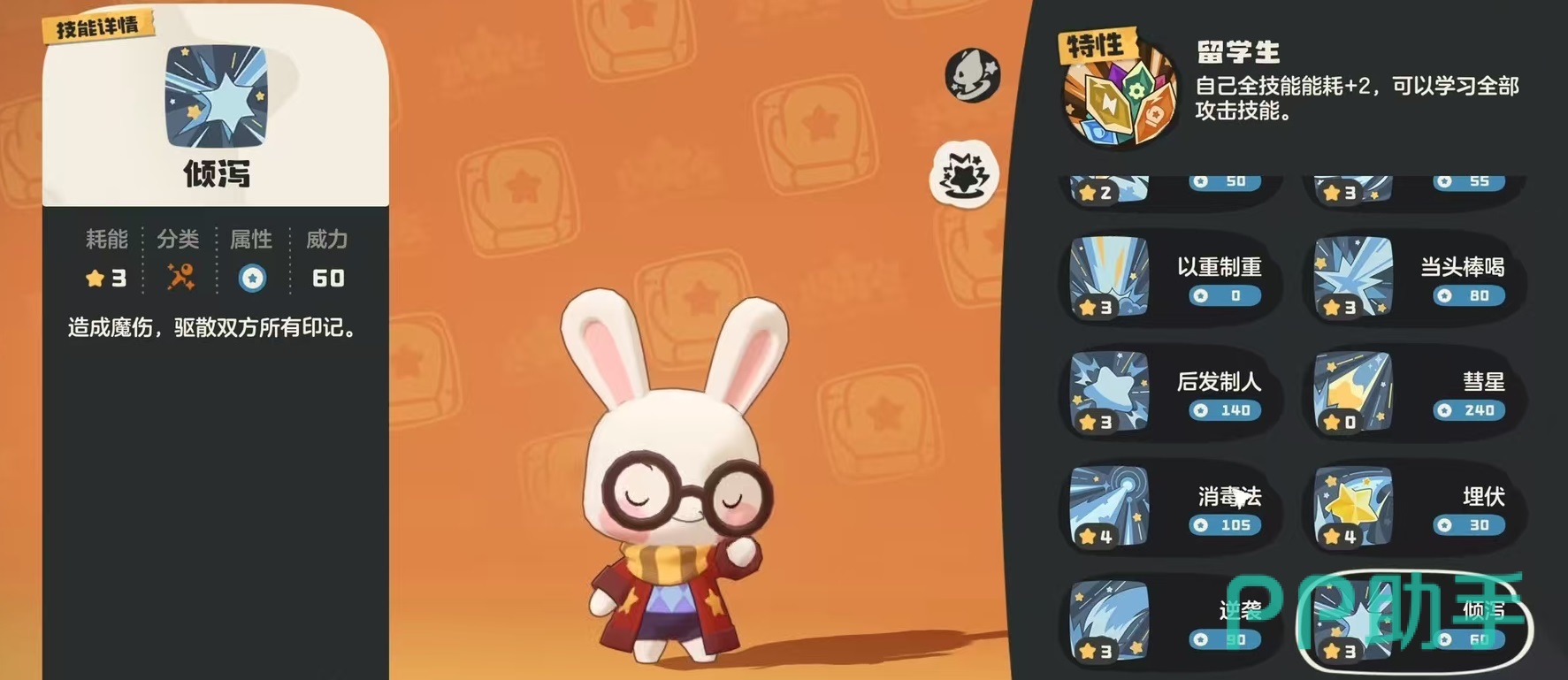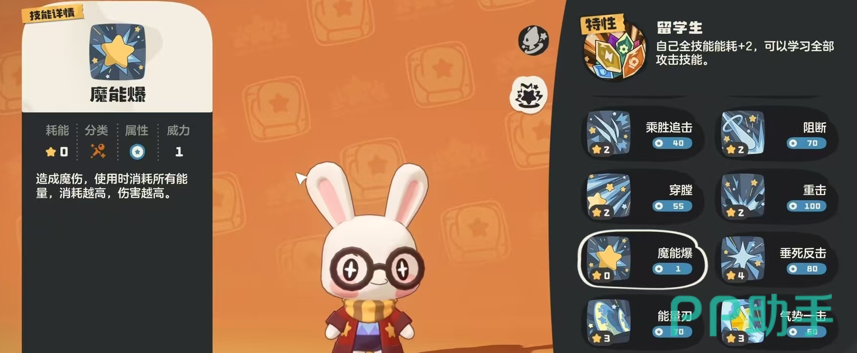 他的被动是留学生,使自身全部技能能量消耗加2点,可以学会全部攻击技能。以增加能量消耗为代价换来学习全部攻击技能效果,这样在选择技能的时候就一定要提前进行规划。在配招方面,普通系只能够使用一个魔能爆,因为魔能爆是属于消耗越高伤害越高。这样自身的特性所带来的魔法消耗,相当于提升了伤害,能够将能量消耗增加所带来的负面影响降到最低。