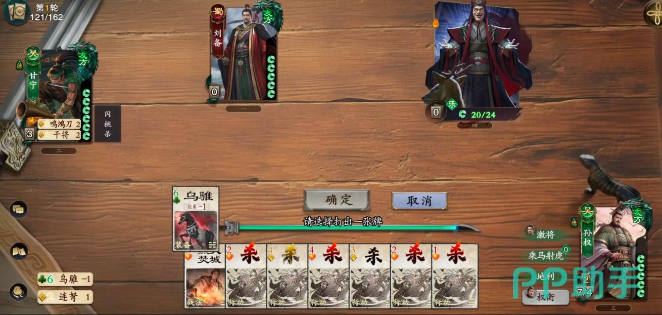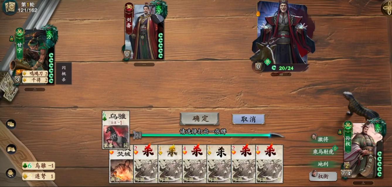 1号位通常选刘备,定位偏辅助和资源调度。对局初期刘备往往是负责把手头的关键资源,比如说黑桃牌交给队友,例如黑桃给甘宁,这样甘宁就可以快速启动。刘备的核心思路是先加快队友的节奏,再根据局势权衡是否保留牌来保护自己或者是补给后勤位的孙权。
