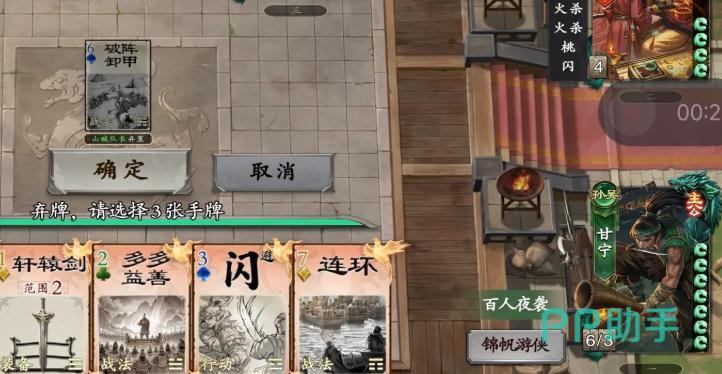 2号位甘宁是这套阵容的输出核心,在对局里主要就负责打关键控制和输出。甘宁的用法是优先用各种控制类卡牌,比如“过河拆桥”、“顺手牵羊”、“烈火焚城”等等可以直接干扰对手手牌,或者打乱对手的节奏,有这些就果断出,没有的话就用“锦帆”等技能来重整手牌。