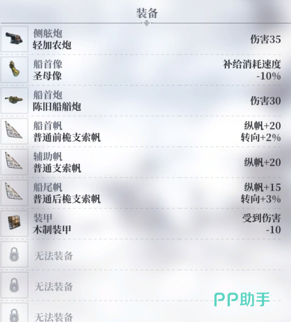 这能搭载的装备也不是什么特别好的装备拥有不少限制,主炮、船首、船帆、装甲都给到了限制没办法使用比较好的装备,这也是导致它属性比较低的一个原因,所以才会说这一艘船真的不怎么样,只要后面能更新,就赶快更新船只比较好。