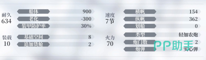 这三个属性分别为900、-300和30%,这三个属性的话也是相当一般普通的了,在看完这三个属性后就都速度火力和装载了,这里按综合值取看分别为7、10和70,这三个属性的话可能只有装载比较好,其它都很弱了。