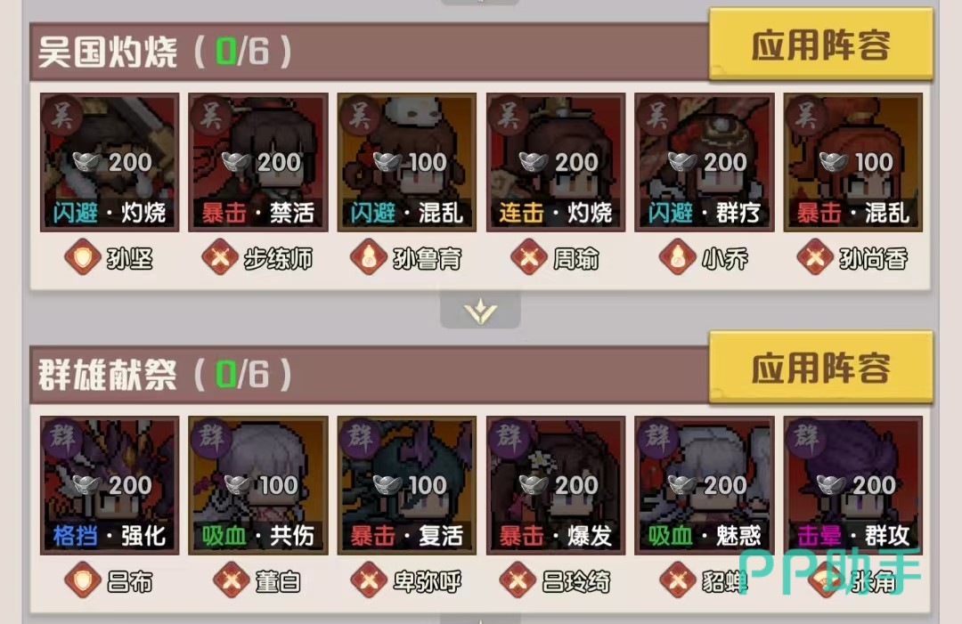 游戏虽然说是卡牌策略向的玩法,但是可以自动战斗,所以说想要玩好游戏的关键是战力,吴国这个属国内的英雄角色非常多,适合搭配成为灼烧队最佳角色分别是孙坚、孙尚香、小乔、周瑜、步练师和孙鲁育。其中可能只有孙鲁育比较好获得一些,其他角色需要玩家微氪下才能解锁。