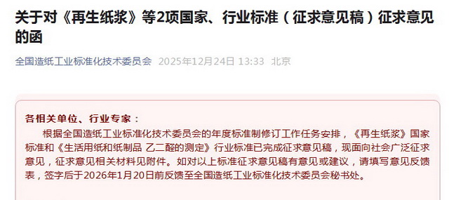 《再生纸浆》国家标准征求意见稿已开始公开征求社会各界意见,截止时间为2026年1月20日。此举旨在严格限制固体废物夹带进入国内,保护生态环境。