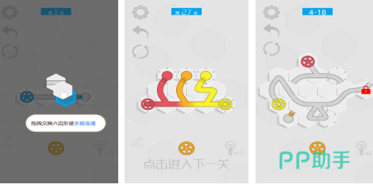 基于六边形网格的流体路径规划游戏。玩家需旋转并拼接不同角度的管道组件,构建无泄漏、无死区的连通系统。关卡数量充足,后期引入多重流向约束与障碍物干扰,要求玩家建立动态空间关系模型,灵活调整解决方案,强化系统性问题拆解能力。