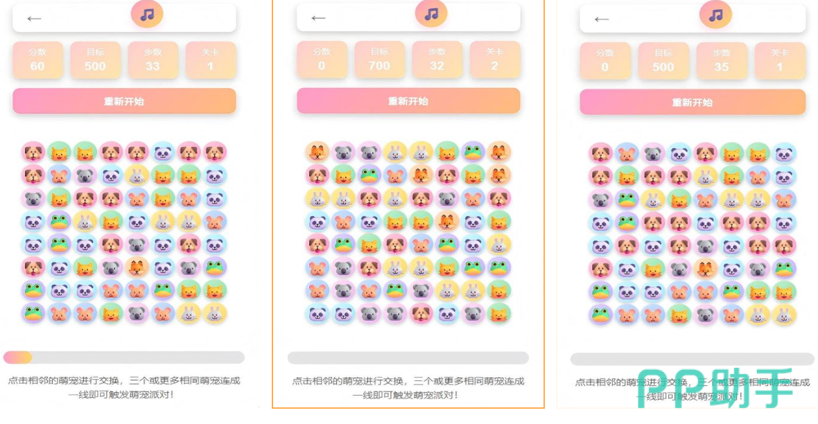 在标准三消框架之上融合宠物图鉴收集与主动技能养成体系。每次成功匹配元素后,系统按概率发放不同稀有度的萌宠卡片,每只宠物拥有独立技能效果,如范围清除、步数延长或障碍软化等,可在指定关卡中手动激活。随着章节推进,任务目标日趋复合化——需同时达成收集数量、限时通关、特定障碍清除等多项条件。场景主题覆盖花园、房间、森林三大视觉单元,各单元对应独立动画逻辑与关卡序列排布,强化沉浸式视觉反馈。通关奖励包含通用货币与专属道具,用于宠物升星、技能强化及新图鉴解锁。