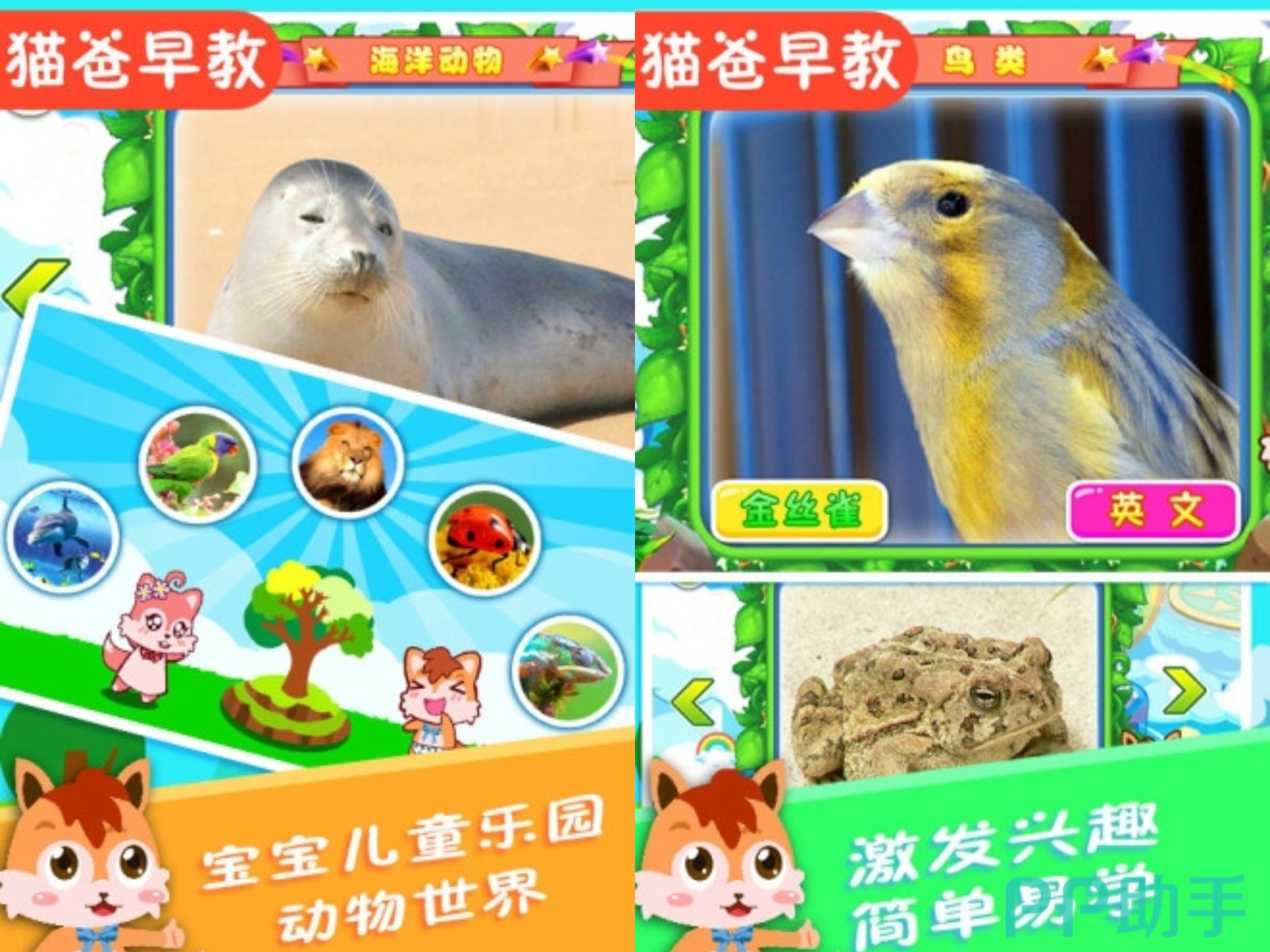 采用高清实景摄影素材,收录狮子、长颈鹿、企鹅、猫头鹰等30余种陆生与飞禽动物,真实还原毛发质感、栖息环境与动态神态。点击任意动物即触发标准中文名称朗读+对应英文单词显示,支持重复播放与手动暂停。内容结构遵循“看—听—认—说”逻辑链,契合3岁儿童语言爆发期的学习节奏,亦可作为日常亲子对话延伸素材。