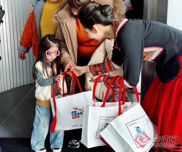 航班平稳降落昆明长水国际机场后,惊喜仍在延续。廊桥处,身着民族服饰的工作人员手持欢迎牌热情相迎,并携手云南山海游旅游集团为旅客送上“冬日云南旅行礼包”。礼包内含东航限定文创纪念品、玩转云南攻略册以及多家合作景区的专属优惠,让云端传递的暖意落地生根,化为一份可延续的旅途诚意。不少旅客表示,此次主题航班不仅提前点燃了他们对云南冬季的探索热情,更在云端完成了一场仪式感满满的“秘境启程”。