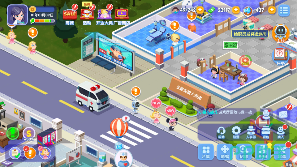 融合日常管理与突发事件应对机制,构建贴近现实医院运作逻辑的模拟体系。玩家不仅需完成建筑分区、科室扩容等基础建设,还需即时响应突发疫情、医疗纠纷、设备故障等随机事件。病情分级制度明确,轻症分流至普通门诊,重症引导至专科病房,随等级提升逐步开放手术中心、康复理疗区等功能模块。