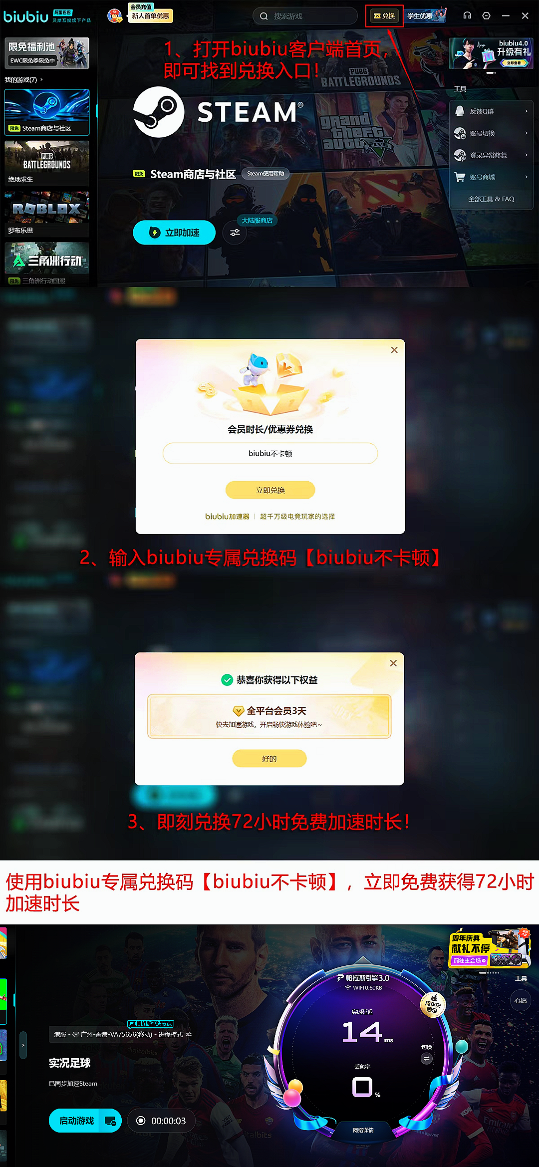 biubiu加速器在业内已形成稳定技术口碑,对新注册用户开放友好试用政策:首次注册即赠24小时全游戏免费加速时长,输入兑换码【biubiu不卡顿】还可额外领取3天使用权,总计达96小时。该福利同样适用于老用户账号,无设备绑定限制。