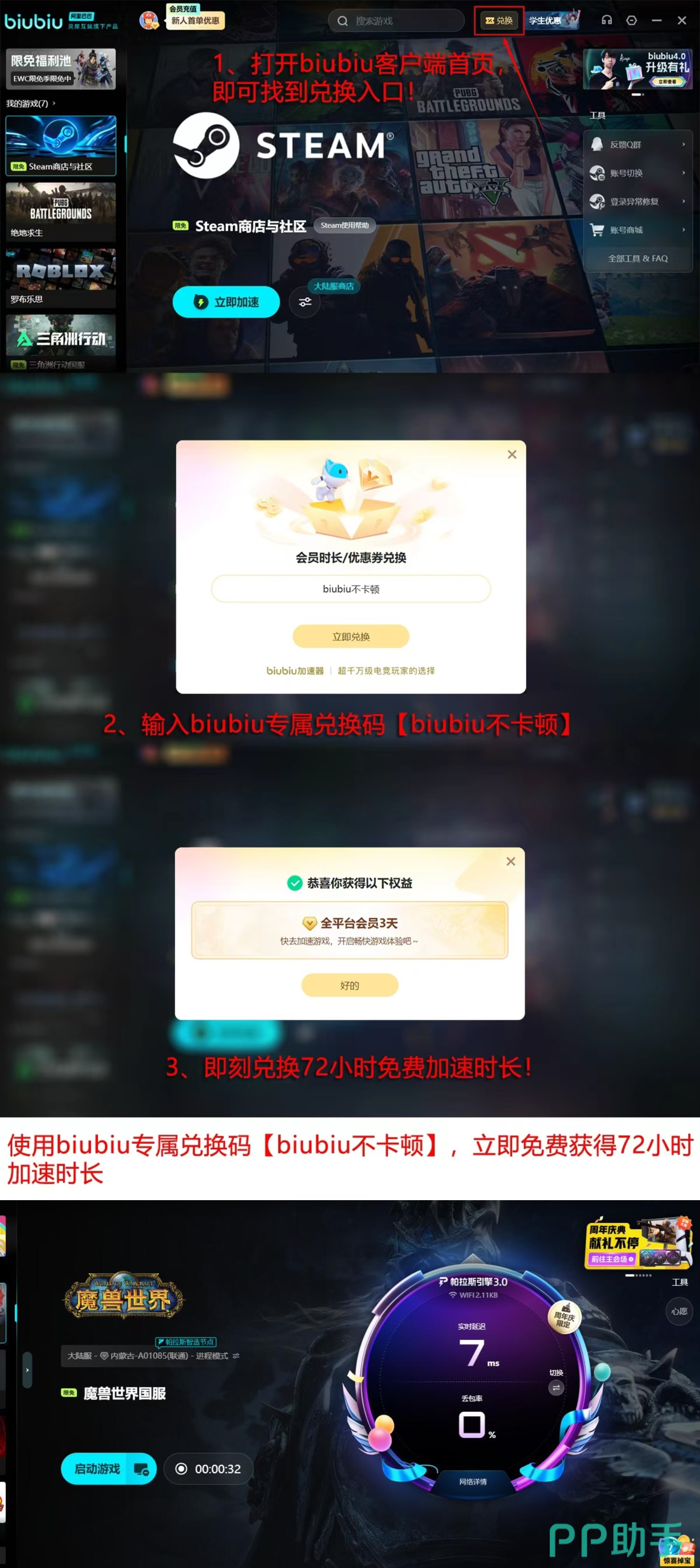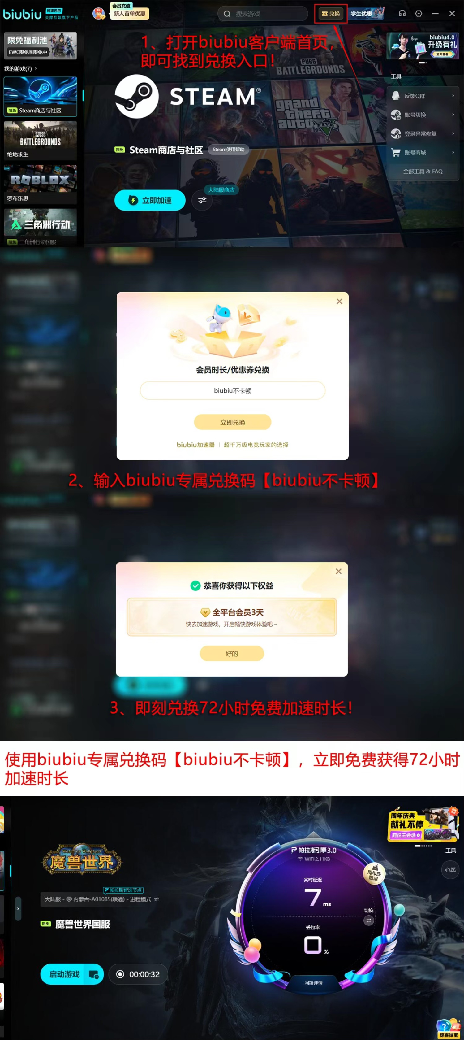 对于计划深入艾泽拉斯大陆的新老玩家,biubiu加速器提供便捷的入门体验:新用户完成注册后,账户自动激活24小时全功能试用权限,足以覆盖多个标准副本周期,直观对比加速前后的帧同步稳定性与操作跟手度。此外,平台同步发放通用兑换码【biubiu不卡顿】,所有用户均可凭此兑换3天连续加速服务,无需额外付费门槛。