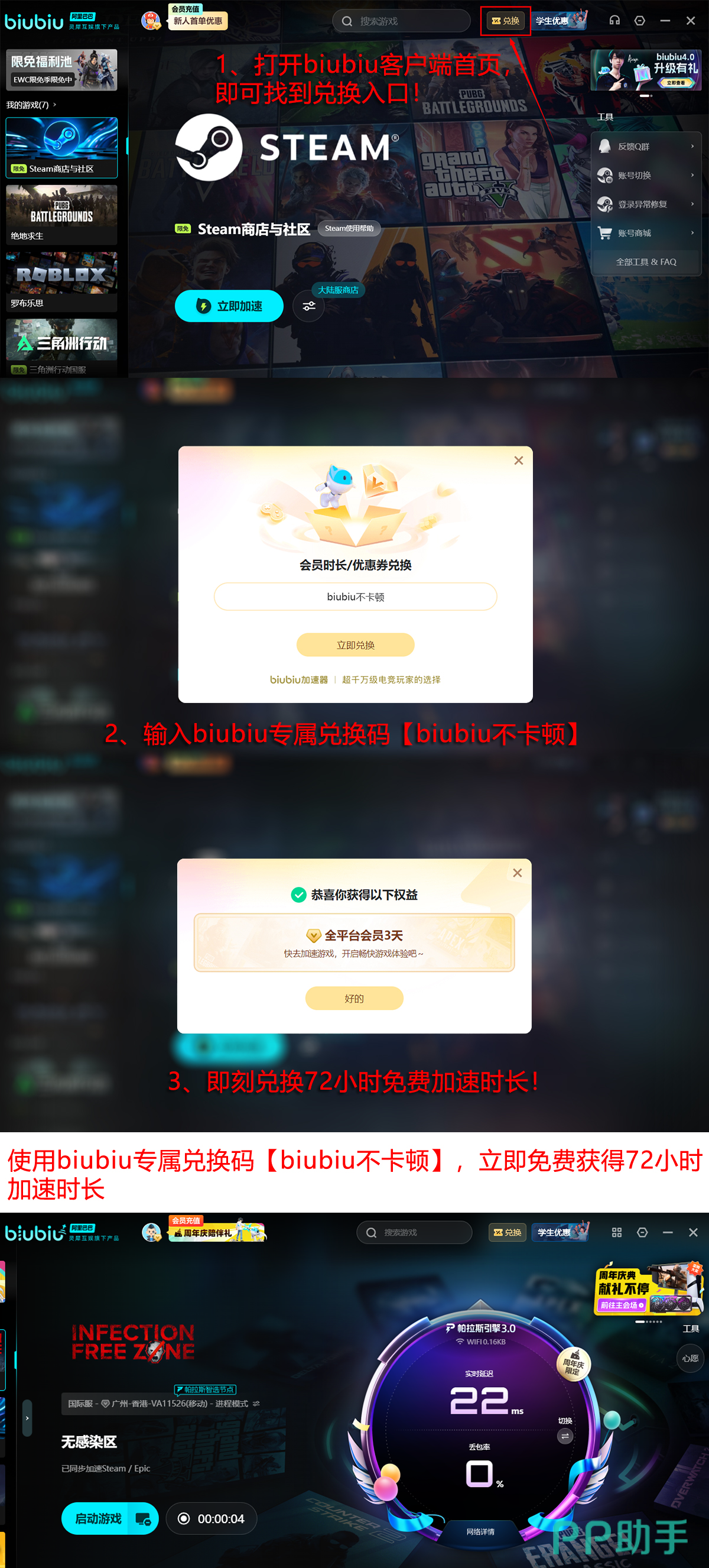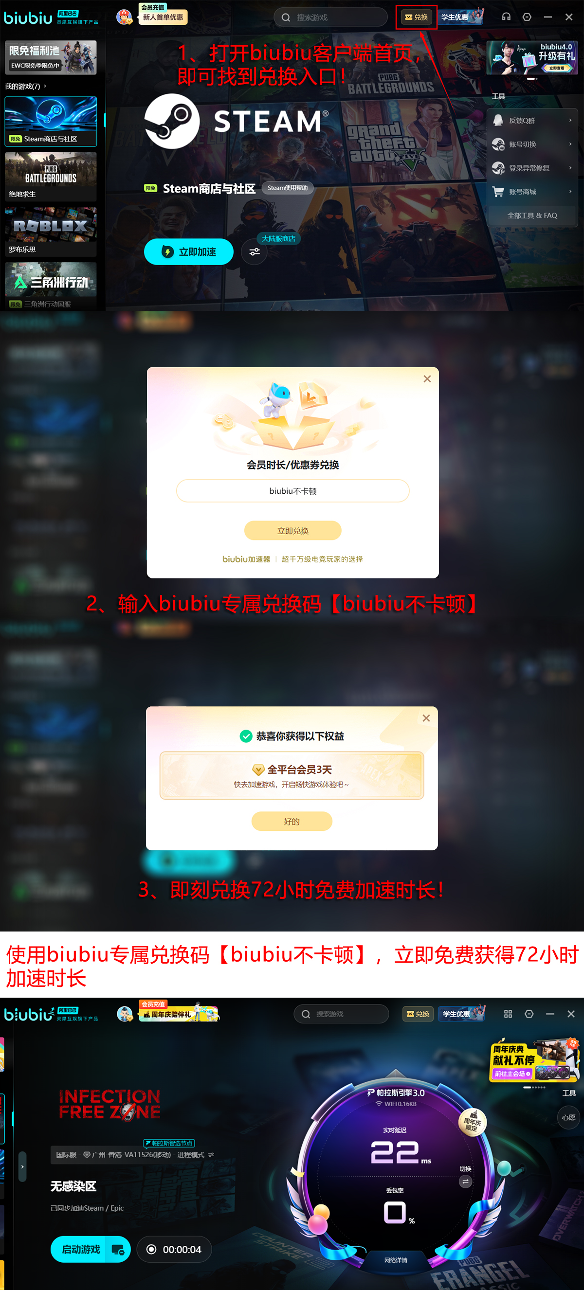 尚未体验过加速效果的用户,现可完成注册流程,立即获取24小时全功能免费使用权。若使用过程中体验良好,新老用户均可在兑换入口输入激活码【biubiu不卡顿】,额外获得连续三日加速权益。对于初次接触本作的新手玩家而言,此举相当于一次性解锁总计96小时的无障碍加速服务,足以覆盖主线全流程及多数支线挑战。