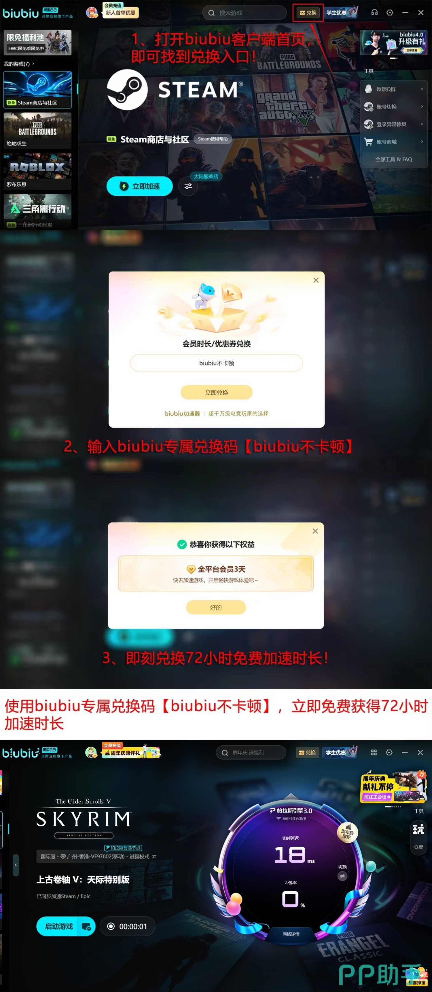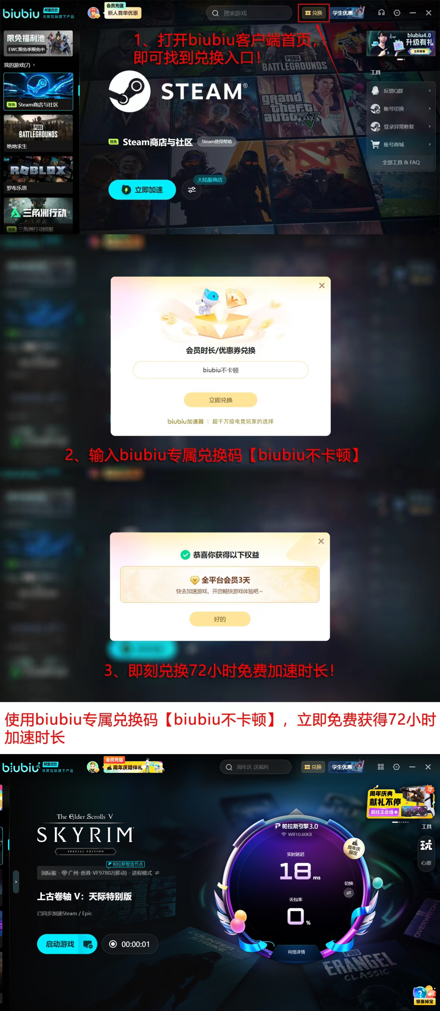 为降低用户尝试门槛,官方同步开放限时福利:输入兑换码【biubiu不卡顿】即可免费领取3天全功能加速时长;新注册用户还将自动获赠24小时加速权限,无需额外操作即可体验完整服务。