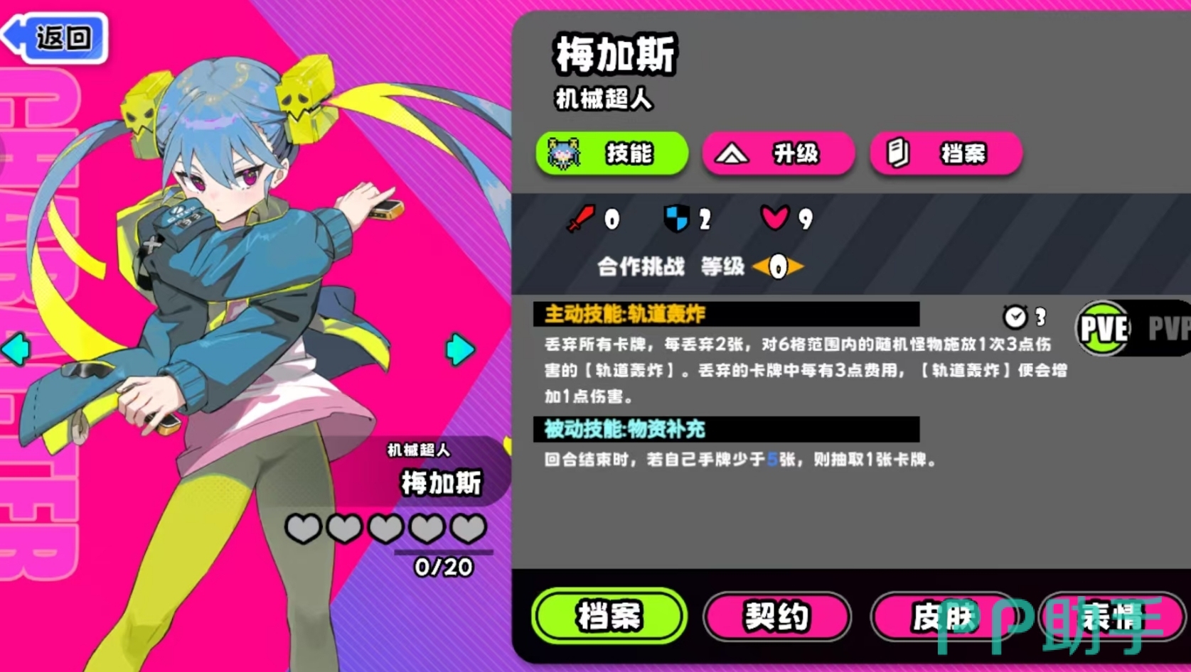 梅加斯以“丢牌即伤害”为核心机制。合作模式下,可一次性打出全部手牌,每消耗2张牌,对六格范围内随机敌方单位造成3点伤害;标准模式中,则无视距离对任意一名角色造成2点固定伤害。此外,若回合结束时手牌数不足5张,还可额外随机抽1张,形成独特的爆发节奏与续航保障。