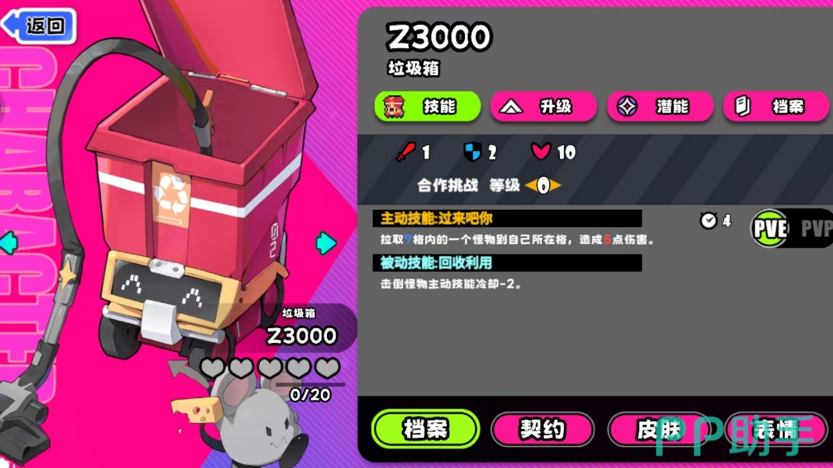 Z3000的核心控制技为强制位移:将目标拉至自身相邻格并造成伤害。合作模式中,该技能可用于集火残血单位,击倒后冷却缩减2回合;标准模式中,可打断对手关键走位——例如迫使其偏离初始点或中心点,干扰升星节奏,属于高战略价值的功能型角色。