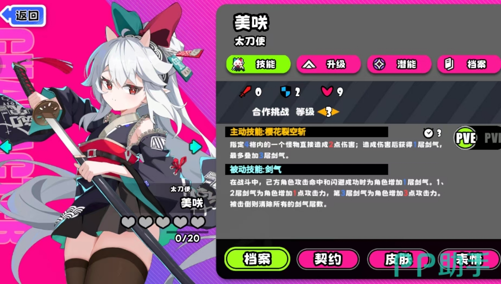 美啖的输出构建围绕“剑气”层数展开:主动技能可叠加1层,且队友每次攻击命中或成功闪避均可为其额外叠加1层。合作模式中,三层剑气可稳定触发高额增益;标准模式虽仅依赖自身行动叠加,但剑气效果不随回合结束重置,具备持续作战优势,属于越战越强的站桩输出代表。