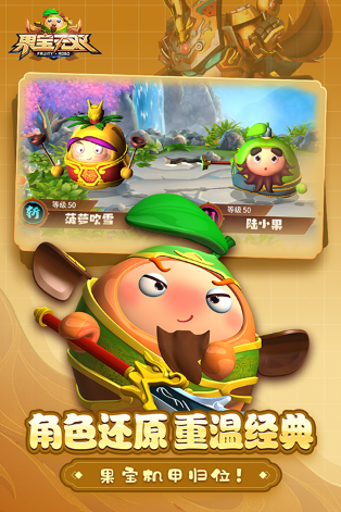 创新融合中国古典历史题材,构建出别具一格的“水果三国”平行世界。剧情起始于果宝角色穿越至三国时期,发现该时空的水果文明正遭受黑暗力量侵蚀。玩家需化身策略统帅,招募西瓜猛将、香蕉军师等特色角色,组建专属军团,通过城池建设、资源调配与实时战术部署,参与阵营对抗与领土争夺。