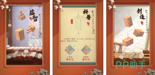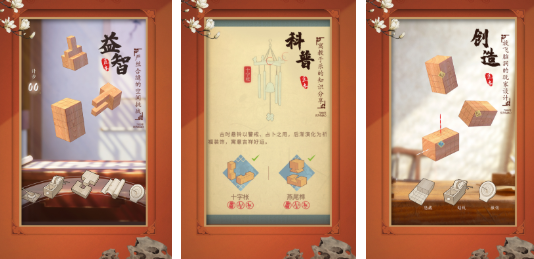 一款根植于中华传统榫卯工艺的国风解谜游戏。全篇采用工笔画视觉语言,呈现典雅东方美学。玩家需依据二维图纸识别构件关系,完成三维立体拼合,共含22个章节、64种结构类型。每关通关后附带简明力学原理说明,将传统文化符号转化为可操作、可理解的认知载体,在静心观察与反复试错中锤炼空间推理能力与专注力。