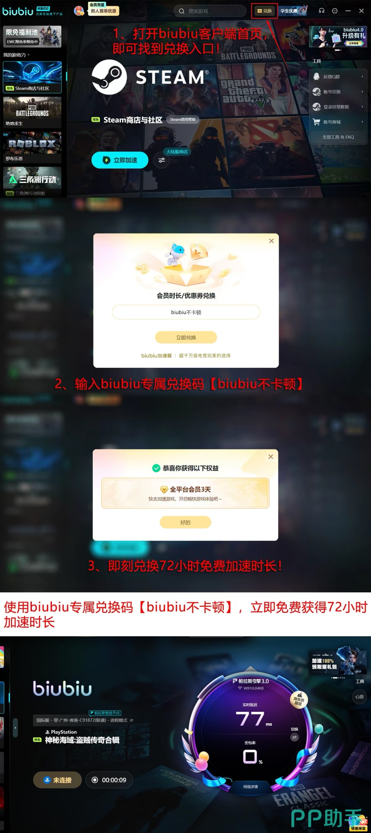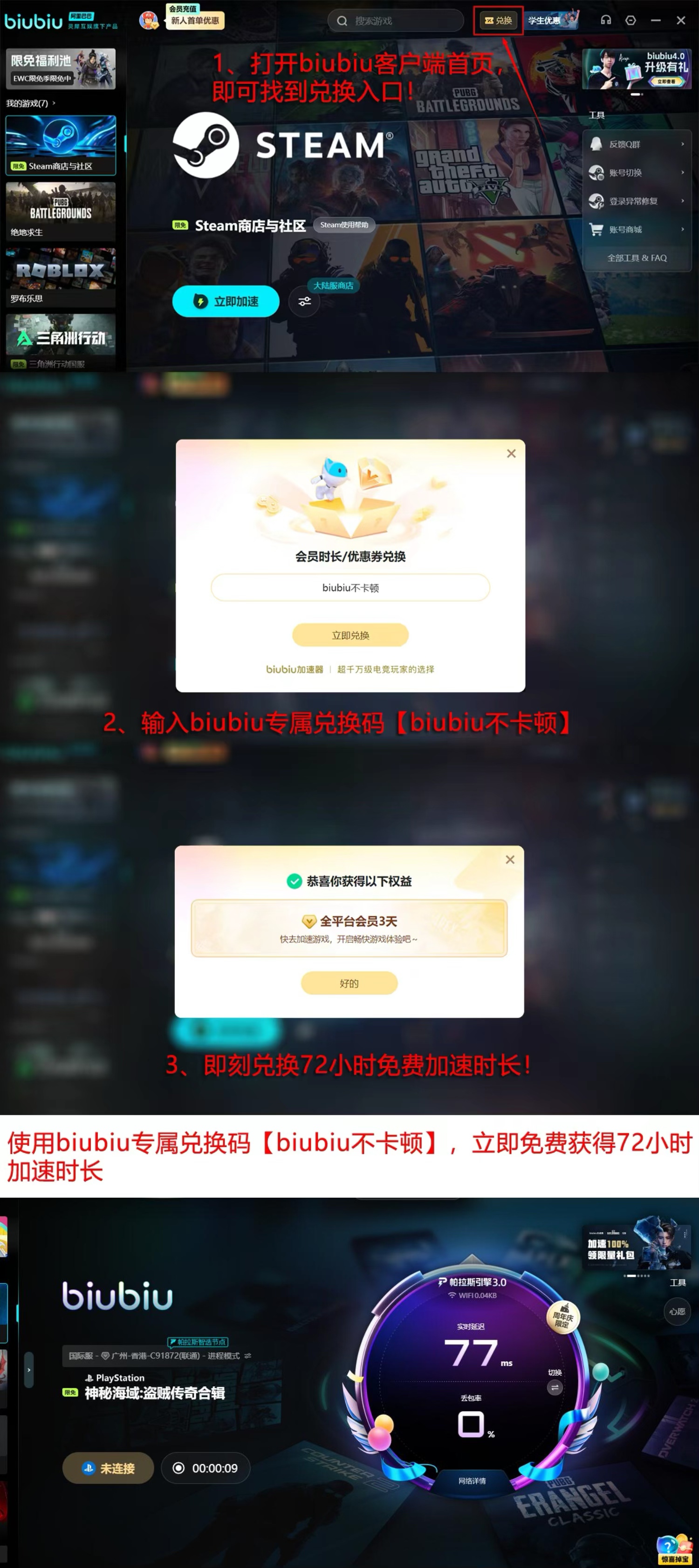 考虑到用户对工具实效性与成本的双重关注,biubiu加速器提供面向新注册用户的24小时全功能免费试用权限。此外,所有用户均可凭兑换码【biubiu不卡顿】额外激活3天高级加速服务,无需绑定支付方式即可体验完整优化能力。