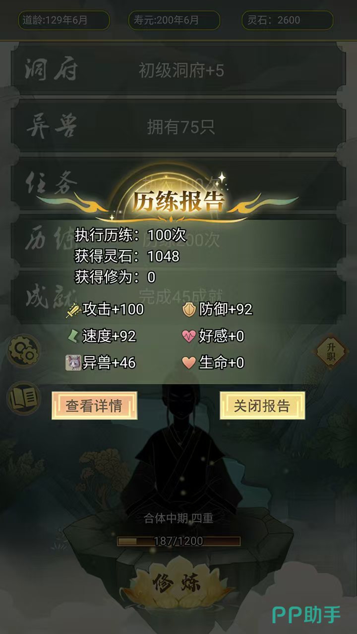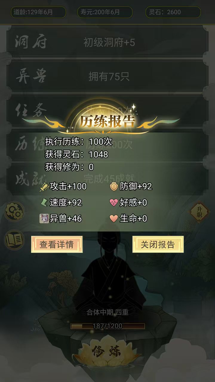 构建具现实约束感的修真生态,玩家起始于宗门底层杂役身份,寿元为唯一不可再生核心资源。游戏划分为四大行为模块:历练(野外遭遇)、任务(宗门指派)、修炼(功法研习)、异兽(驯服/驱使)。每项操作均消耗寿元,且存在成功率浮动与反噬风险。数值成长严格绑定资源转化效率——灵石用于兑换丹药、属性点影响突破概率、特殊事件触发依赖前置条件达成。最终目标是从奴籍脱身,历经外门、内门、真传三阶晋升,达成飞升成就。