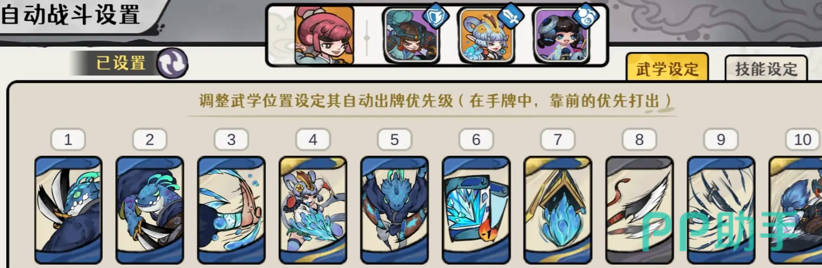 例无虚发2、追月飞刀2、拂袖神功1和飞刀1,自动出牌可以像下图一样设计,水木灵儿能回复队友200%攻击气血的回复技、银枪公子让队友获得300%防御护甲的技能都是选择立刻释放,无情的技能选择在武学释放结束后使用。