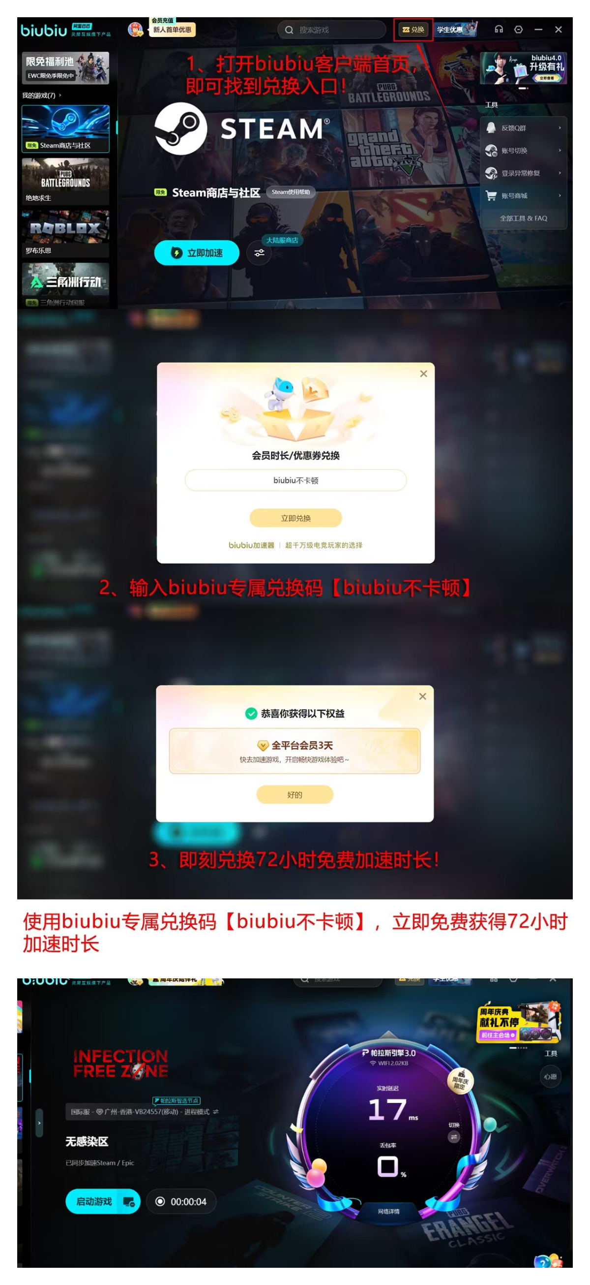 目前,biubiu加速器面向新用户提供注册即赠1日免费使用权的福利;所有用户还可通过输入兑换码【biubiu不卡顿】额外领取3天服务时长。两项权益叠加,新用户最高可享累计96小时无限制加速体验。该活动具有时效性,建议有需求的玩家及时参与,以便在《无感染区》中获得更稳定的联机环境与更高的生存容错率。