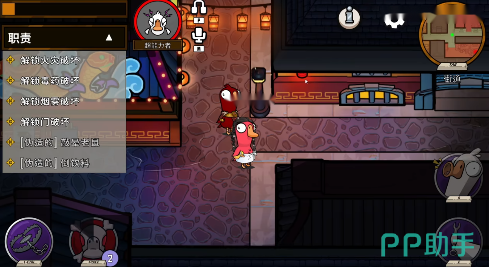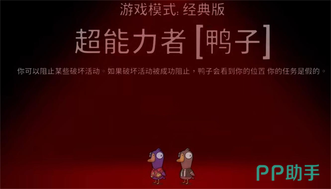 超能力的鸭子主要的能力可以阻止破坏活动,这个能力对于反派阵营没有多大的帮助,但是可以用来迷惑正派的阵营,从而达到出其不意的作用,它的能力在日常的投票踢人阶段不是很大,但是在最后决定胜负的时候能够非常强的淘汰信任你的大鹅,保证自己成为mvp。