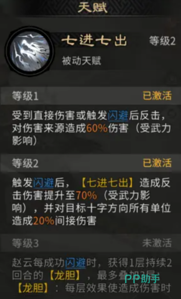 赵云的天赋“七进七出”会在受到直接伤害或触发闪避后反击,对伤害来源打出60%伤害,升到2级能在闪避触发后,让造成的反击伤提升到70%,并对目标十字方向所有单位造成20%间接伤,升到3级能在闪避时获得伤害提升的龙胆效果。