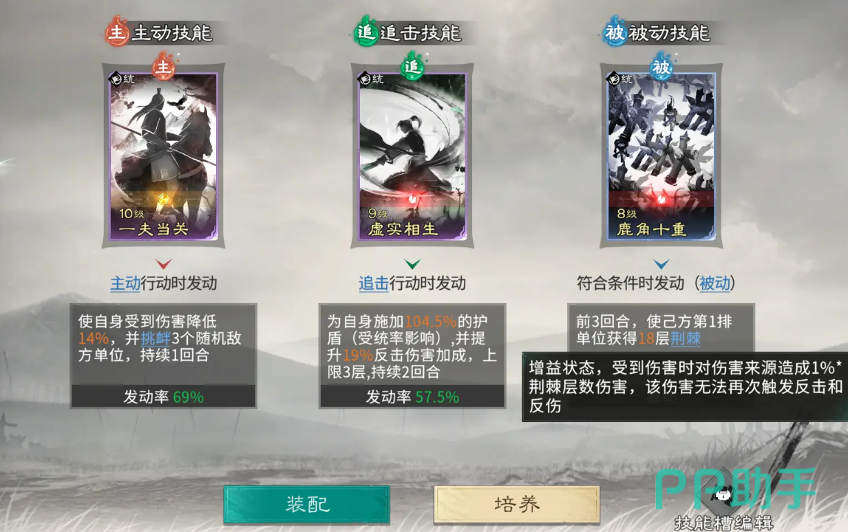 他的追击技推荐去带虚实相生,这能为自己施加上104.5%的护盾,并提升19%反击伤害加成,上限为3层能持续2回合,这个护盾加反击伤同样和赵云契合度非常高,最后的被动推荐带鹿角十重。