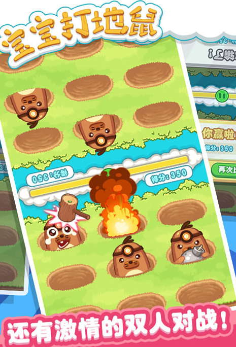以经典打地鼠机制为基础,专为低龄儿童优化设计。音效活泼清脆,打击反馈及时,配合软萌卡通画风与高饱和色彩界面,有效吸引幼儿注意力。支持本地双人同屏模式,孩子与家长可分屏同步操作,共同完成限时敲击任务。关卡难度梯度平缓,随进度逐步增加地鼠出现频率与移动速度,兼顾趣味性与能力发展需求。