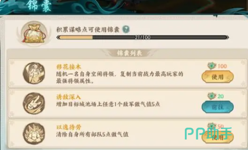 谋略点作为关键中间资源,可通过战斗结算与地图事件双重途径获取,并用于锦囊系统兑换战术增益:消耗100谋略点可激活“移花接木”,随机复制当前战力最高武将的全部属性;20谋略点可释放“诱敌深入”,使目标敌军增加5点傲气值,干扰其进攻节奏。活动期间表现优异者将授予“军神”称号,并发放大量活动兑换币,用于活动商店兑换限定道具;阵营最终积分排名还将决定元宝及兑换币的发放档位,形成个人与集体双重激励闭环。