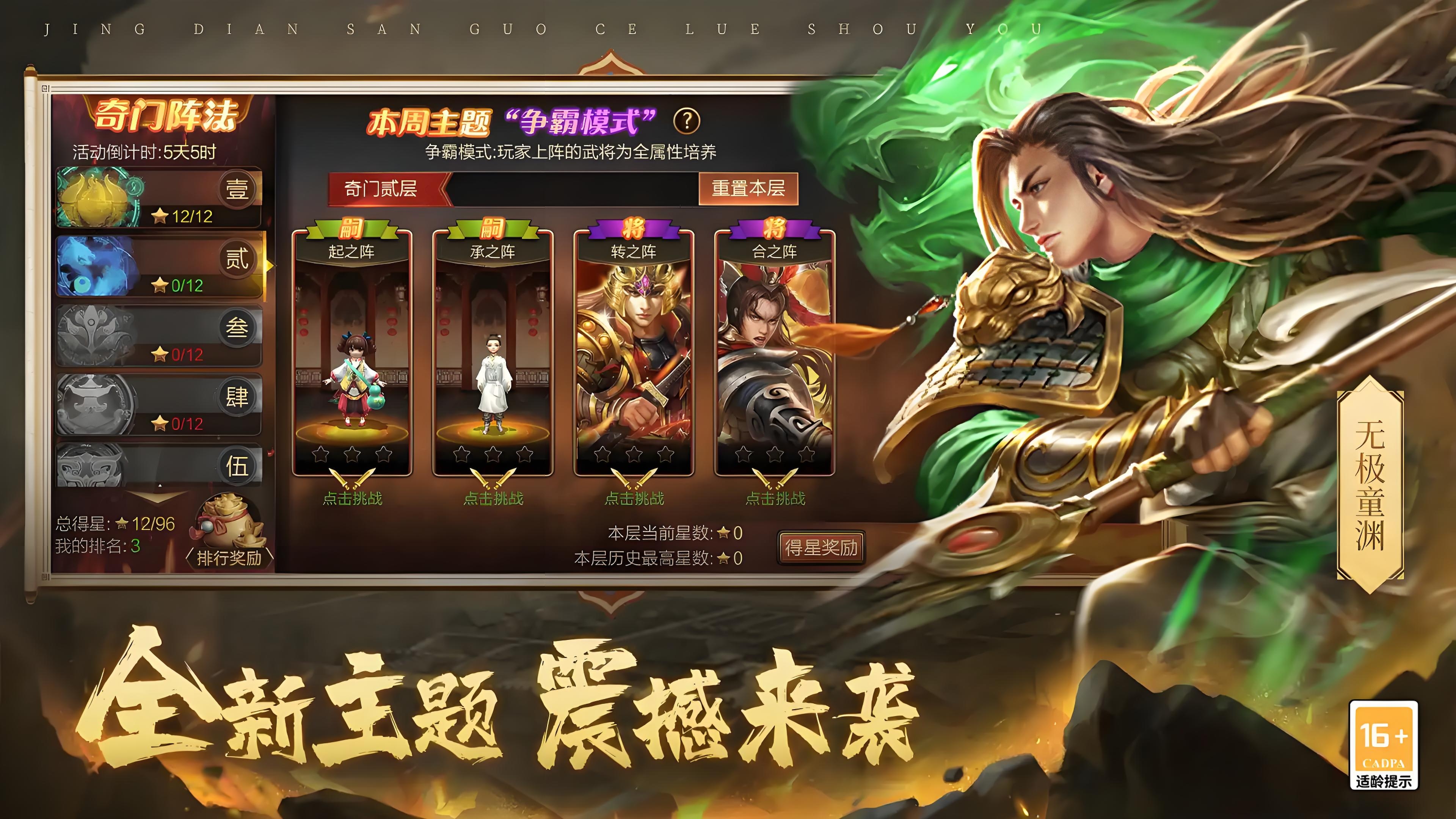深度还原东汉末年群雄割据历史背景,采用高品质武将卡牌系统,涵盖关羽、诸葛亮、吕布等数十位经典人物。每位武将拥有专属技能动画与成长线,支持升星、进阶、羁绊激活等多重养成路径。结合实时国战、跨服争夺、军团协作等玩法,强调阵容搭配逻辑与时机把控,兼具历史厚重感与现代策略张力。