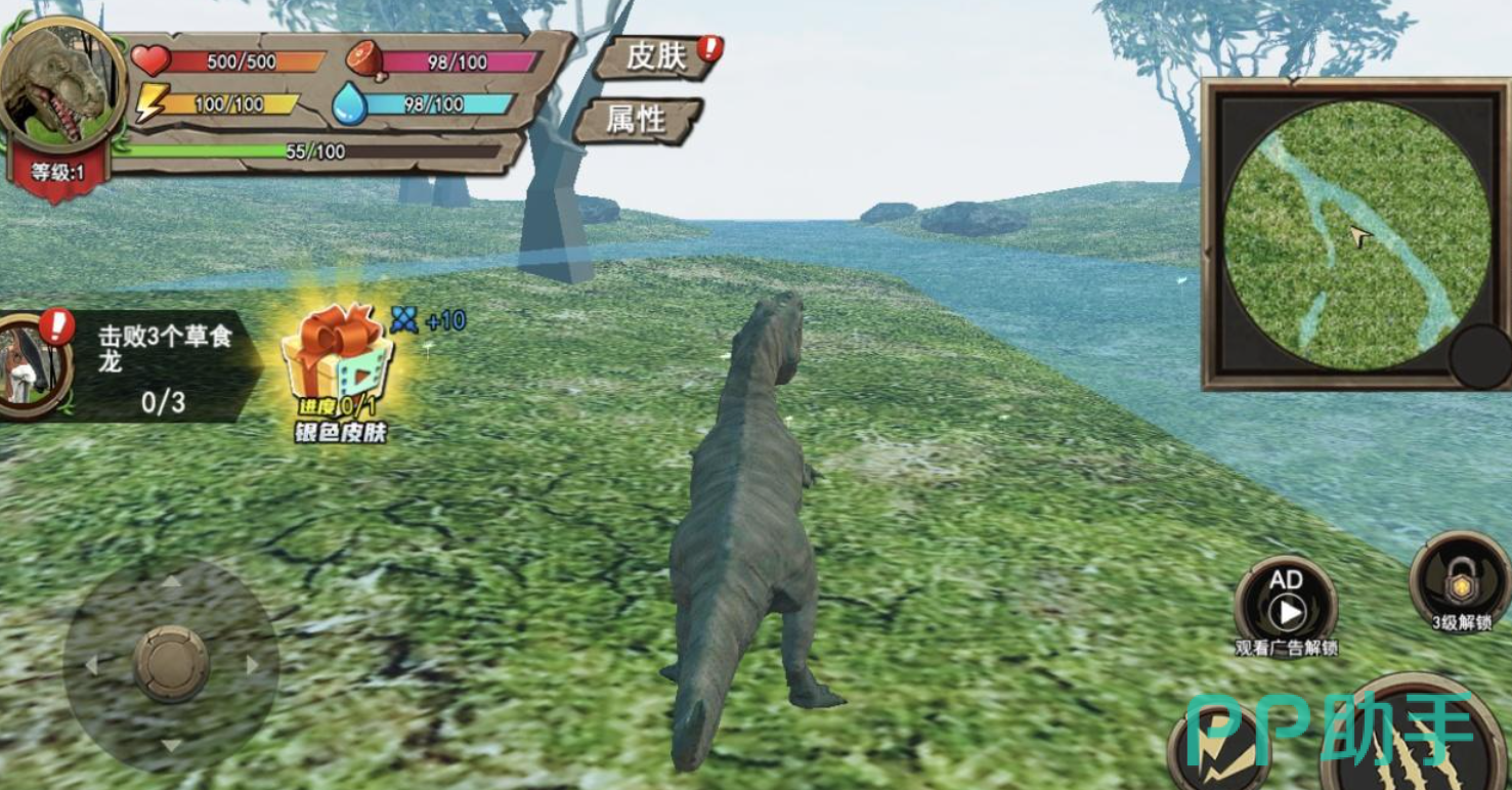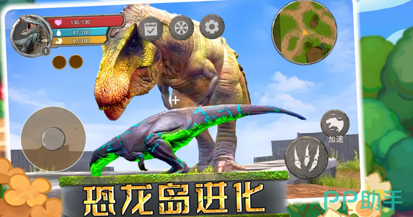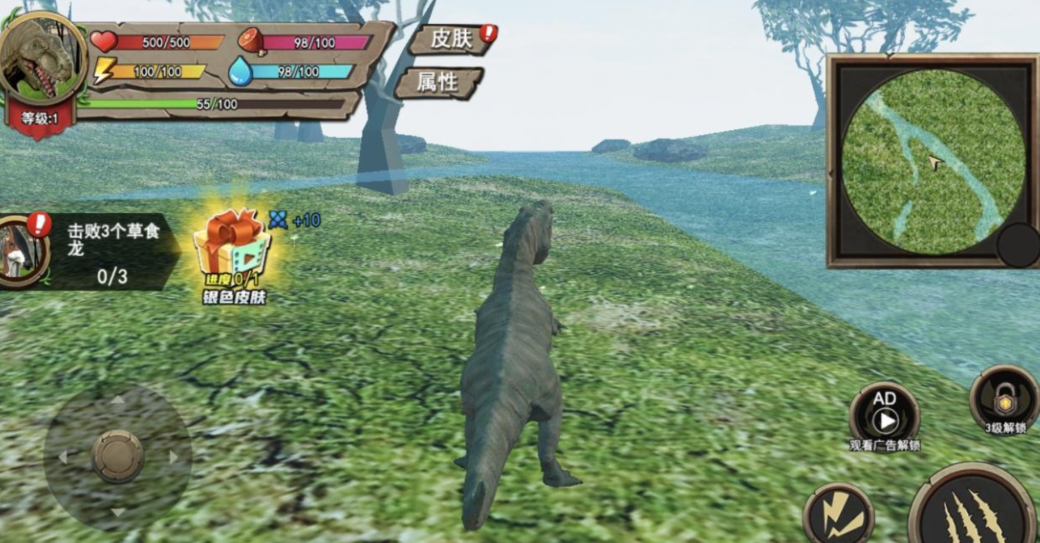 背景设定严格对标侏罗纪中晚期生态体系,地图包含海岸线、内陆盆地与火山带三类主区域;恐龙体力值随行动持续下降,需主动追击并成功捕获猎物方可恢复;食物链覆盖鳄形超目、软骨鱼类(含巨齿鲨)、蛇颈龙目及大型蟒类等十余种史前掠食者与猎物;采用动态饥饿系统,长时间未进食将触发虚弱状态,影响移动速度与攻击命中率;进化节点明确标注所需能量阈值与对应猎物体型等级,成长路径可规划性强。