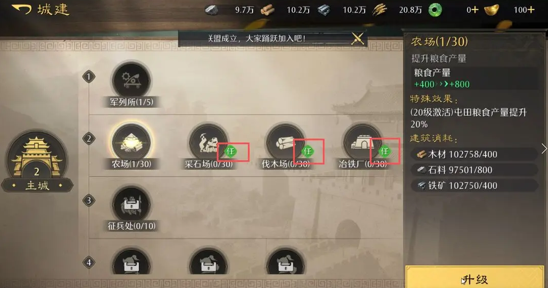 前期的重要资源争夺点是桃源河外城区域,由于守军的难度是有差异的,所以建议大家前期先将一星和二星的进行清理,之后等部队等级升至15级,主城升到12级再挑战更高难度的。由于屯田的时候,政令是比较稀缺的资源,每个小时恢复的数量是固定的,所以建议大家算好时间使用,不然会造成资源浪费。