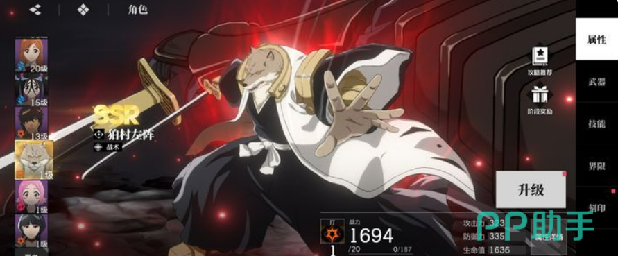 黑崎一护为SR品质角色,主打高机动性近战输出。其普攻具备四段连击结构,每段命中均可积攒灵压值;一技能为突进型斩击,命中后可衔接追加攻击,操作流畅度高;二技能需灵压满格方可释放,具备大范围群体伤害,在日常刷图与竞技场对抗中均有稳定表现。完成卍解形态解锁后,整体伤害提升45%,并附加虚化状态增益,显著强化持续作战能力。