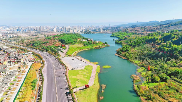 碧水嵌城、翠峰环抱的曲靖市美景。 记者 张雯 摄
