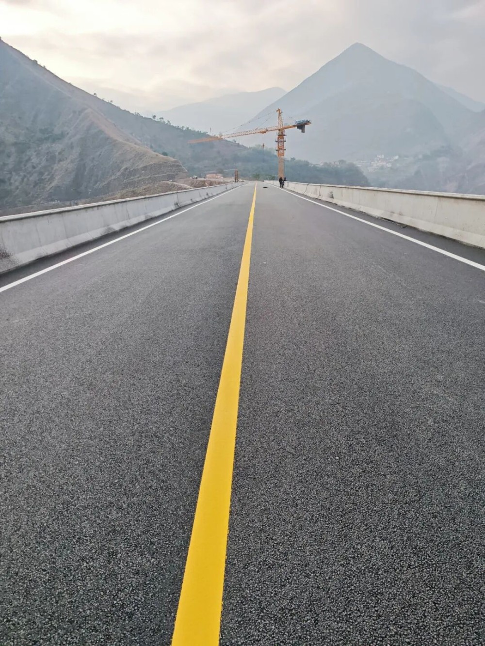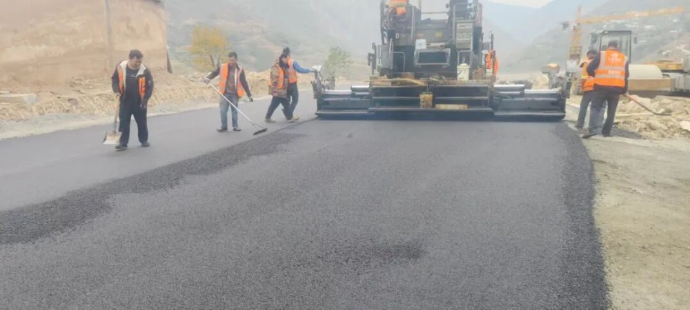 12月27日,在廖家沟大桥施工现场,摊铺机已经完成沥青的摊铺,压路机正在对路面进行压实,工人正在进行桥面标线施工,大家正抓紧时间完成扫尾工程。
