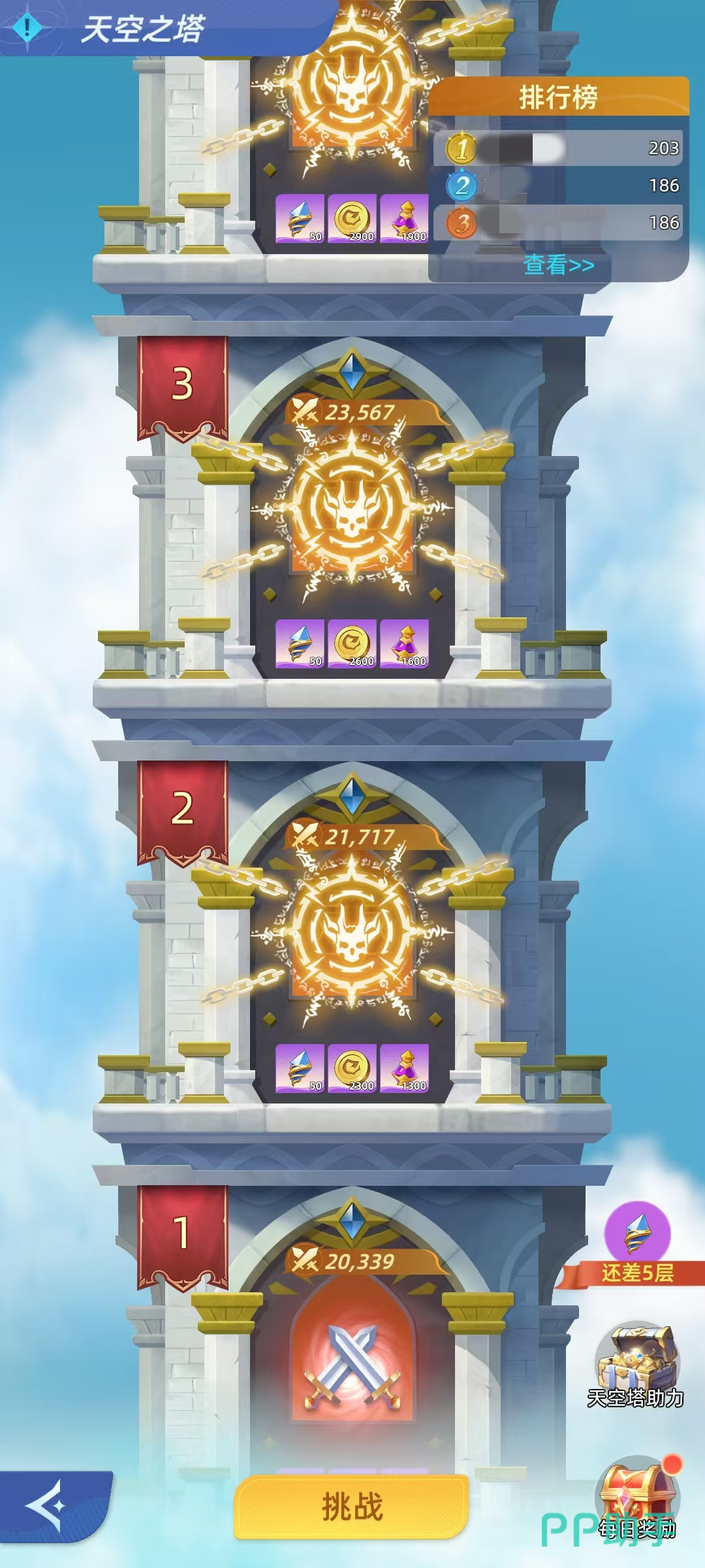 那每天的0点,系统会刷新一次天空之塔的每日奖励,玩家可以根据昨天通关的最高一层,领取到对应的奖励。这就意味着只要之前顺利推进,第二天便可以直接拿到更高层次的日常收益。即使当天不再继续往上挑战,也不会影响昨天最高层次带来的领取额度。所以对待这项活动,比较合理的操作是在战力充足或者是有时间的时候,集中往前推进,提升最高层次的上限。在战力停滞或者是没有太多时间时,可以稳定领取日常奖励为主。这样可以确保资源不断。