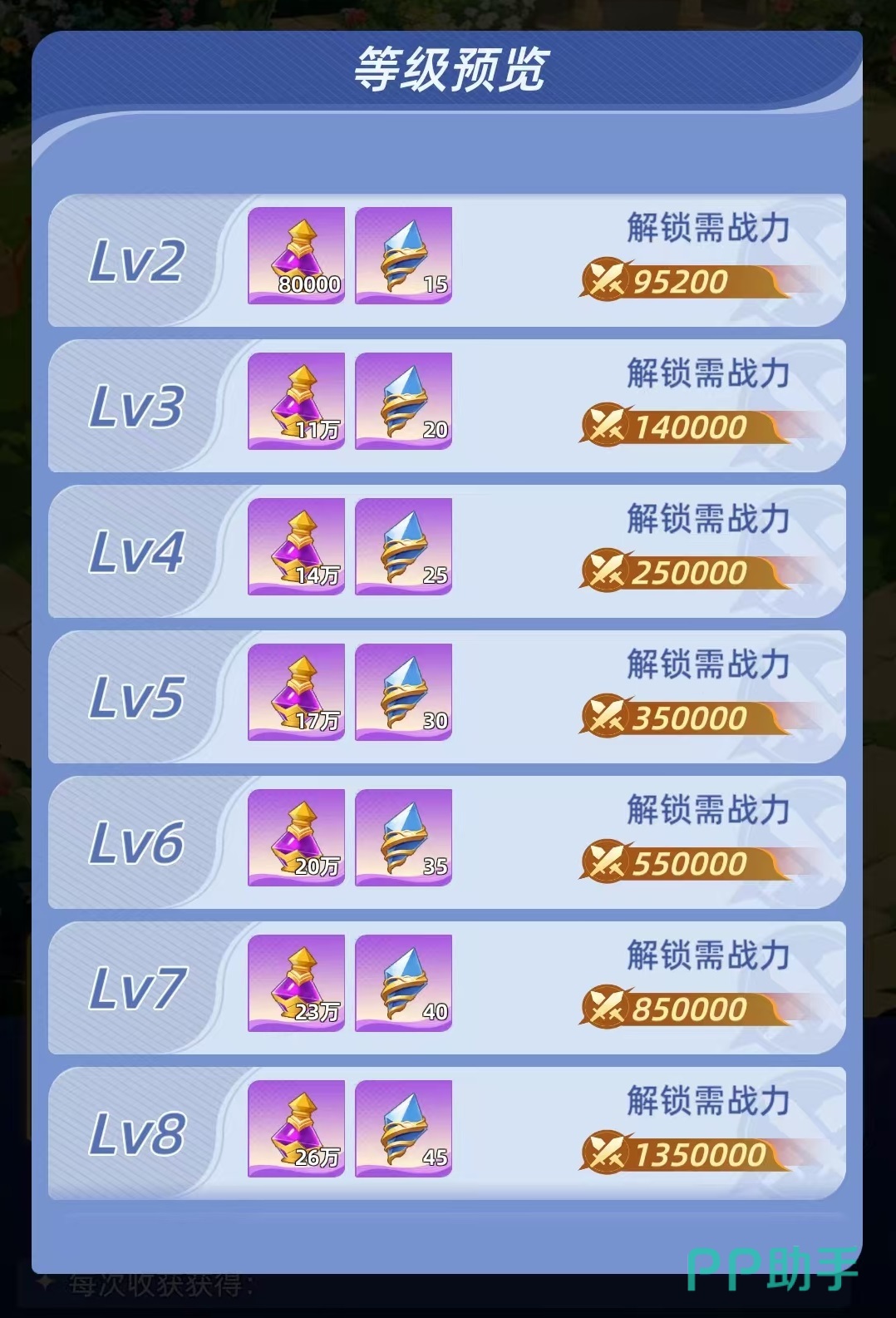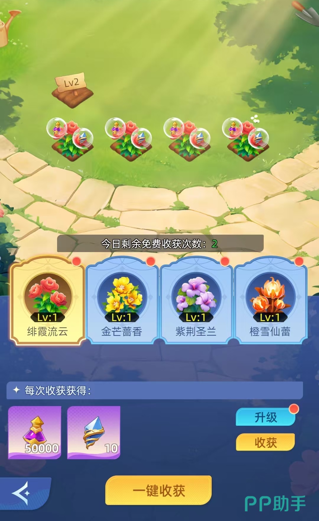 整个花语仙境活动就如同名称那样,充满了各种各样的鲜花,整个仙境由多片功能各异的花园组成,是玩家日常获取关键养成资源的稳定来源之一。每片花园每天都拥有两次免费次数和两次钻石收获次数,这两者都会在每天的0点进行重置。当用完免费次数后,可以消耗钻石进行钻石收获。如果当天战力提升或者是花园进行升级,那么再使用钻石收获会更加划算,所以这个活动的建议放到每天的后面,先完成升级和挑战等其他任务,然后再把次数使用出去,以放大收益。