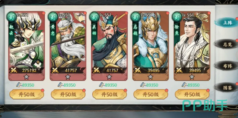 第二主流派为蜀国“五虎速攻流”,主打高爆发、强打断与自洽生存体系。核心成员包括张飞、关羽、诸葛亮、刘备。关羽为战术中枢,“水淹七军”具备大范围硬控+前排技能打断双重效果,为后续输出创造安全环境;张飞“当阳怒吼”衔接刘备“仁德”,实现攻击附带持续治疗,使队伍无需专职治疗位即可维持中高血线。该组合在PVE推图与快节奏PVP中表现优异,整体成型后具备快速终结战局的能力。