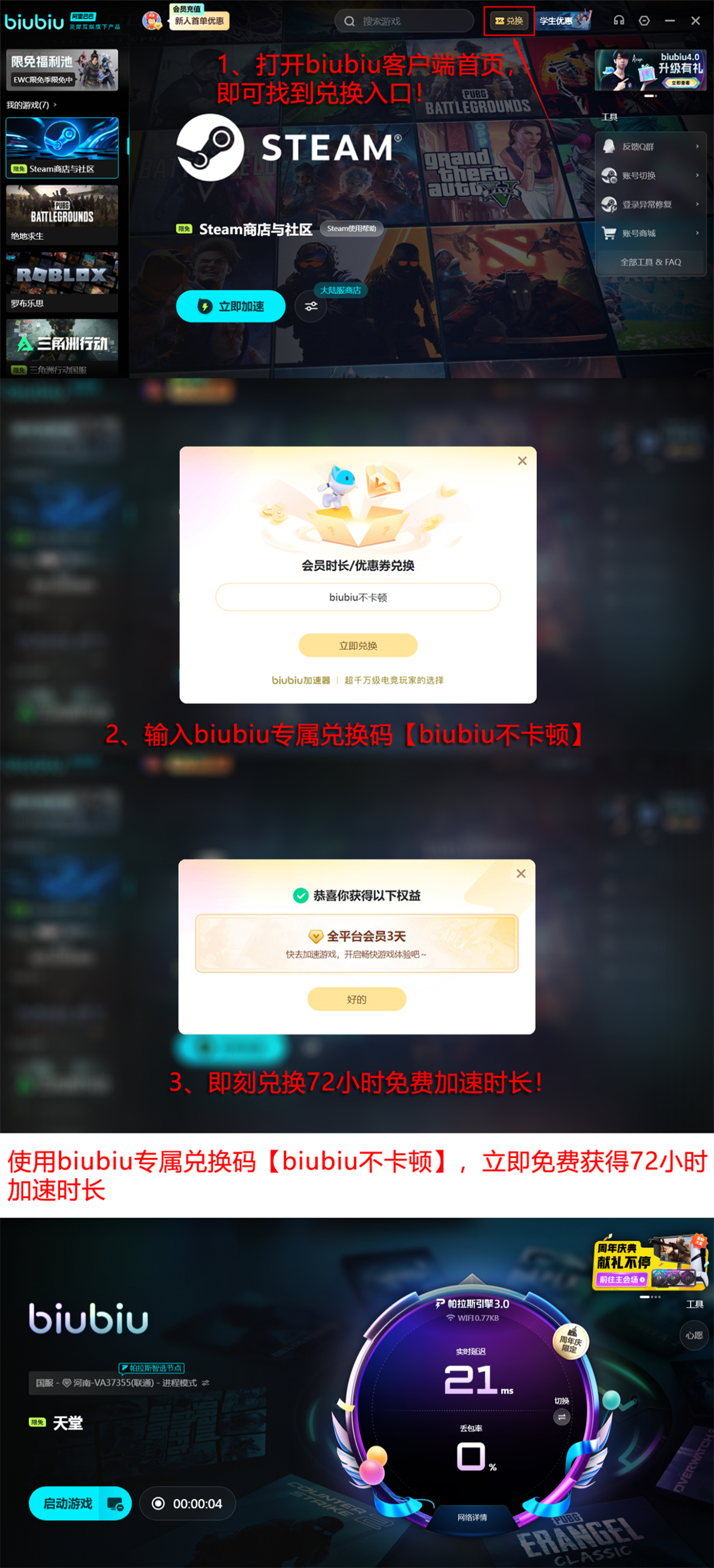服务资费方面,biubiu提供灵活订阅体系:支持按月续订、季度包及年度套餐,新用户完成实名认证后可享首充特惠;在校学生经学籍核验还可叠加专属折扣。注册即赠24小时全功能免费加速体验;另可通过兑换码【biubiu不卡顿】额外领取72小时加速时长,充分满足短期测试与长期使用双重需求。