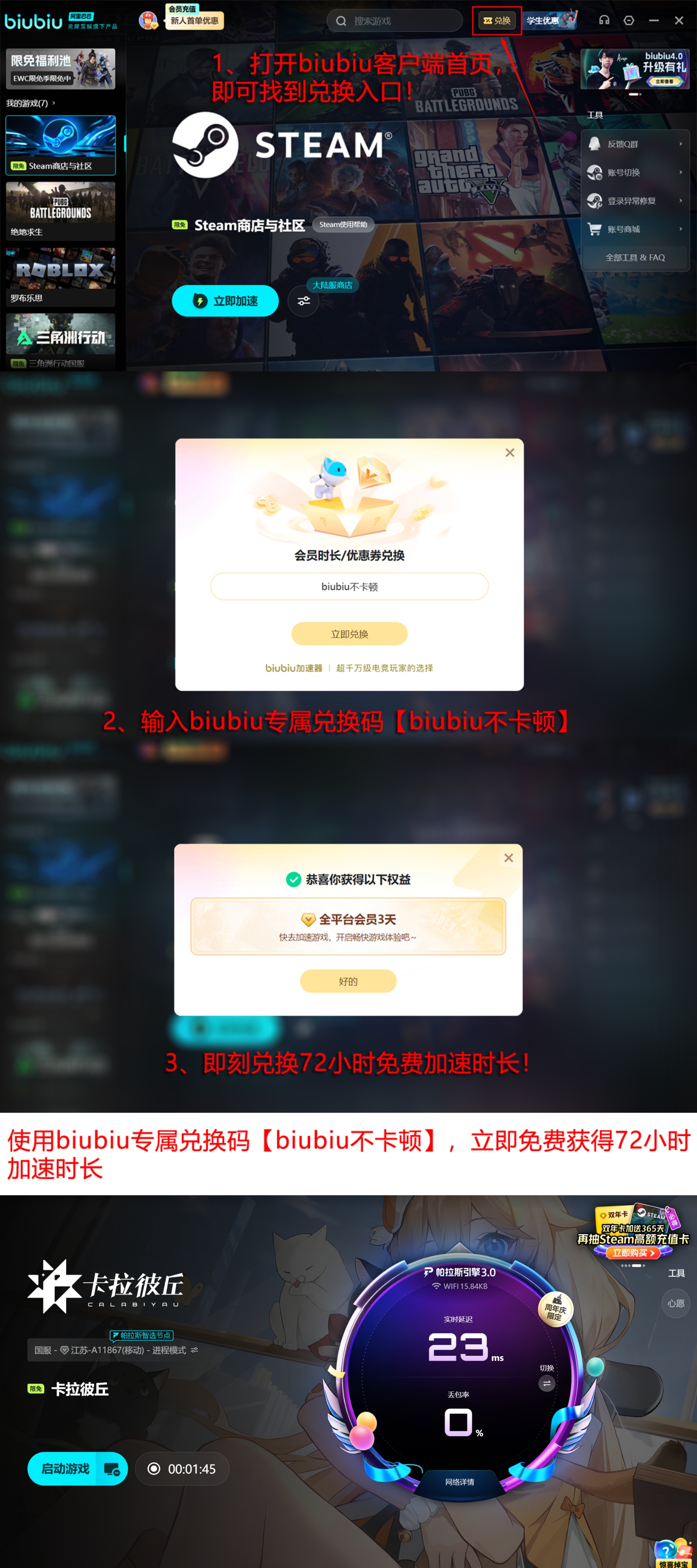 对于尚未尝试的用户,接入门槛极低:新注册账号即赠24小时全功能免费试用期;叠加输入专属口令【biubiu不卡顿】,还可额外获得3天加速服务。累计6天的有效使用周期,足以覆盖多场完整排位赛程,直观验证闪退问题是否得到实质性缓解。此外,biubiu内置玩家交流社区持续沉淀实战技巧与配置方案,其限时免费加速专区(具体支持游戏以客户端内公示为准)亦为拓展体验提供了便利入口。