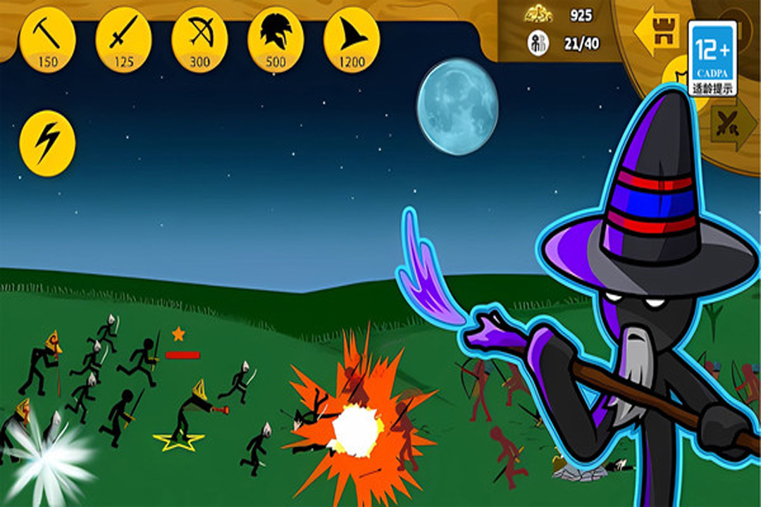 本作为火柴人战争系列正统续作,核心目标为摧毁敌方雕像。游戏构建完整的战略循环:派遣矿工采集黄金→消耗资源训练兵种→部署部队展开攻防。共设12个基础兵种及多个特殊兵种,兵种间存在明确克制关系;战场引入地形高低差与动态天气系统。模式涵盖战役闯关、无尽生存及实时PvP对战。