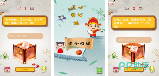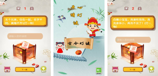 本作以元宵节庆为叙事底色,界面融合红灯笼、剪纸窗花、祥云纹样等典型视觉符号,辅以明快欢腾的民乐配乐,营造身临其境的灯会氛围。题库涵盖字谜、事谜、物谜三大类经典题型,总量达数千条。每答对一题即获积分奖励,用于解锁新关卡;系统无冗余任务链或成就压力,专注还原“一谜一思、一思一得”的纯粹解谜节奏。