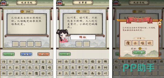 按主题垂直划分题库专区,设“百草堂”(植物类)、“香果楼”(果蔬类)、“成语书院”(成语典故类)等模块,支持用户按兴趣定向挑战。全部谜题经专业筛选,内容覆盖中药常识、日常器物、唐诗宋词等跨领域知识点;提示功能采用渐进式设计——仅在用户连续两次输入错误后触发,兼顾引导性与探索自主性。