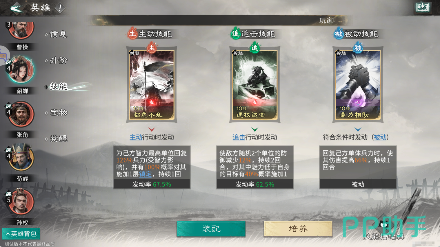 貂蝉推荐大家主动带上临危,这样可以让我方的智力最高位恢复状态,再加上荀彧王佐效果加持可以让张角的智力属性轻松提升15点,还能叠加镇定效果,能够免除控制。追击技能推荐大家带通权达变,可以随即让两名敌人减少12%防御,此外还能够有一定的可能产生睡眠效果。被动建议大家带鼎力相助,可以联动追击临危不乱,这样张角在恢复兵力的时候还可以获得增伤效果,能够轻松打出爆炸输出。