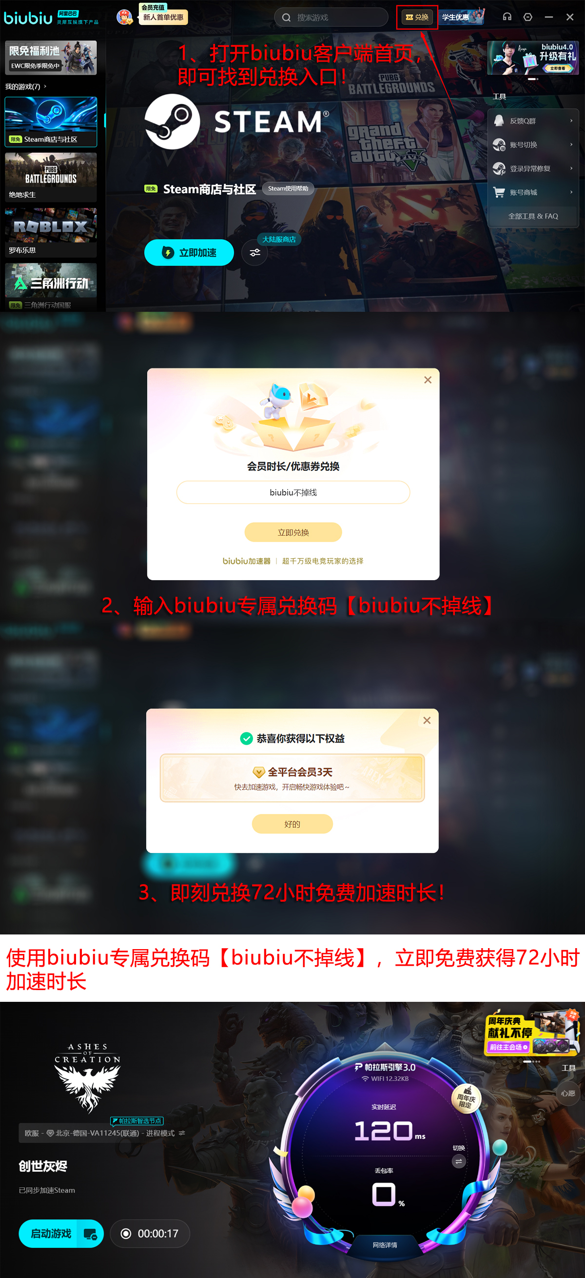 新用户注册即享全功能体验权益:成功创建账号后自动激活24小时无限制试用权限;在激活界面输入专属口令【biubiu不掉线】,可叠加获得72小时高速通道使用权,累计最长体验时长达96小时,覆盖完整下载、安装及初期剧情推进周期。