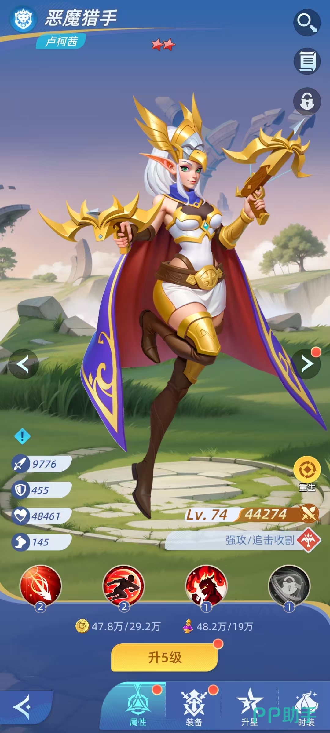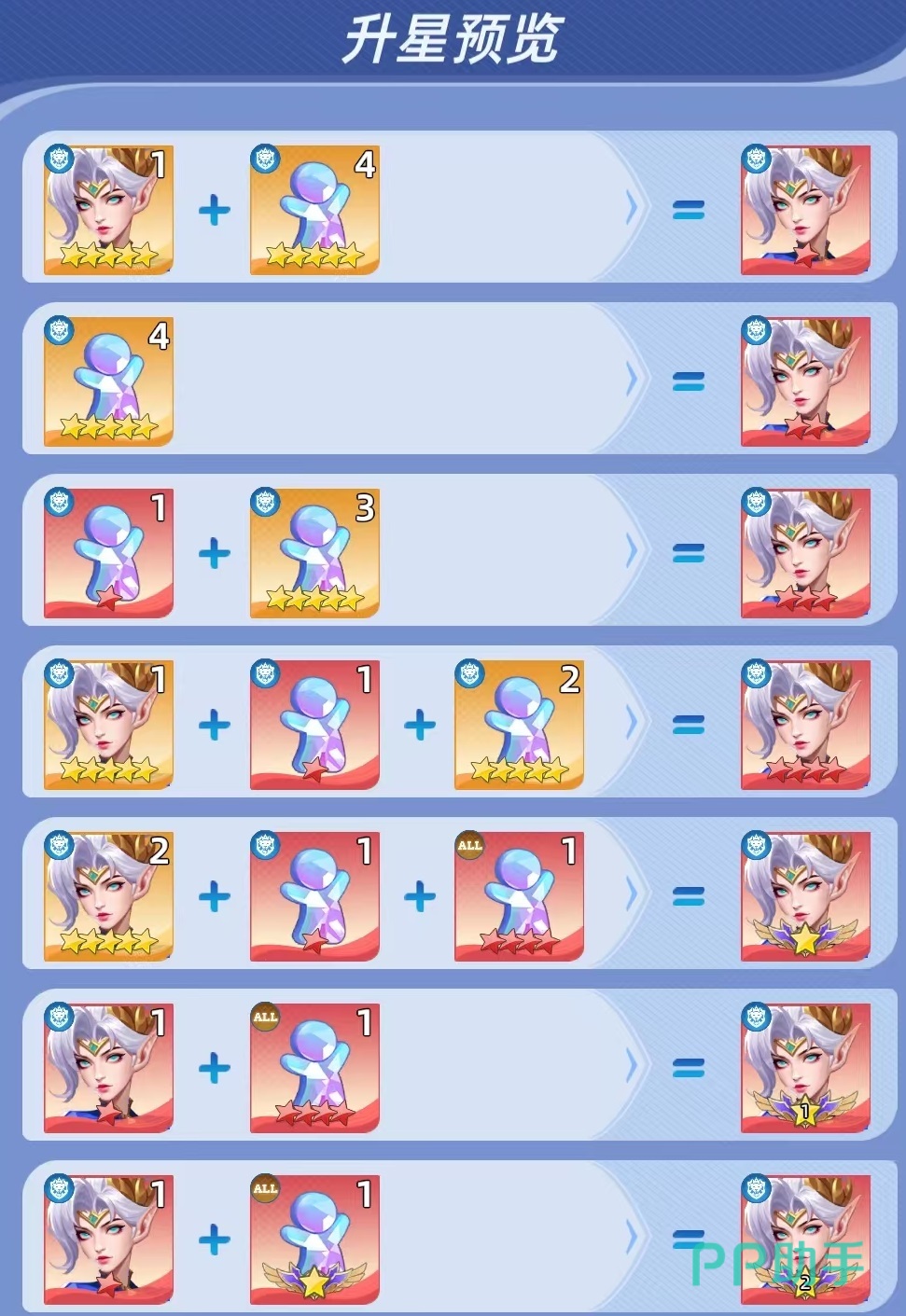 接下来是升星,升星是决定英雄上限的重要环节,需要消耗的资源也最多,主要包括指定阵营的卡牌,或者是同名指定星级的卡牌为素材,对目标英雄进行升星。升星除了可以提升属性与等级上限之外,还可以自动解锁更高级的技能。在升星中玩家可以提前查看到需要的材料和升星后数值预览,这样可以提前做好资源储备。实战中因为资源有限,所以只围绕着主力核心先优先升星,根据阵容需求补齐前排,然后才是控制和治疗等辅助单位。