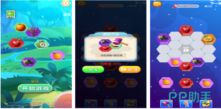 区别于常规方格布局,本作采用蜂窝状六边形棋盘,相邻可消单元增至六个方向,大幅提升组合可能性与策略纵深。内置三类功能型道具:范围爆炸、行列清除与随机重置,均通过关卡达成条件解锁。画面信息密度高但排布有序,配合粒子消散动画,营造出强沉浸式的解压氛围,特别适合缓解高强度工作后的精神压力。
