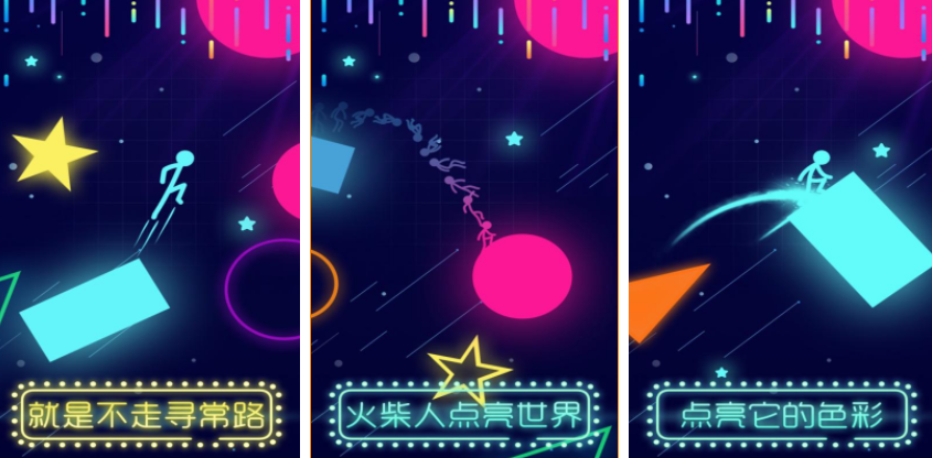 游戏构建于纯黑基调的几何空间之中,玩家控制简约火柴人角色,在悬浮平台间精准起跳。每次接触图形表面即触发光效反馈,逐步驱散黑暗区域。关卡设计强调空间预判与节奏把控,尤其针对镂空结构需调整落点或利用反弹机制绕行,兼具视觉反馈与操作精度训练价值。