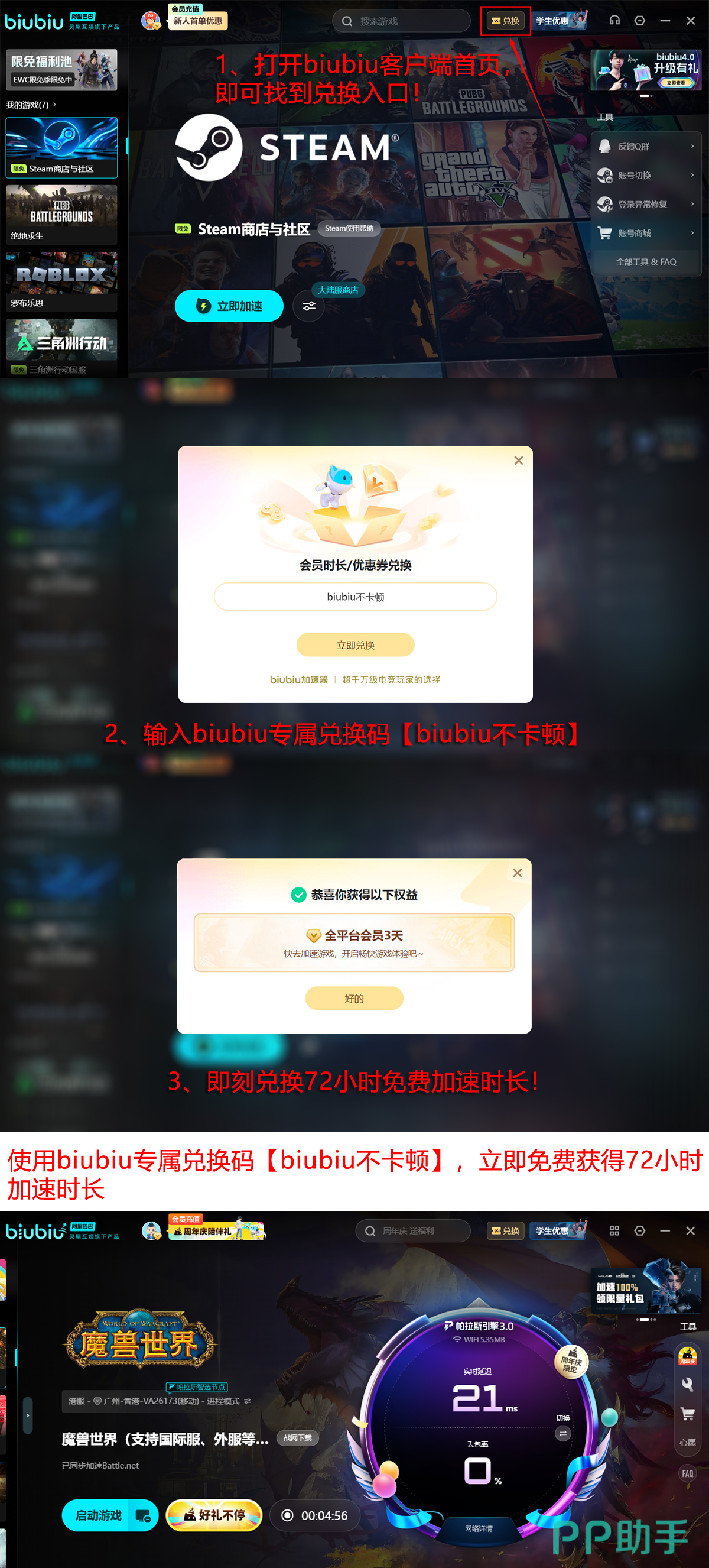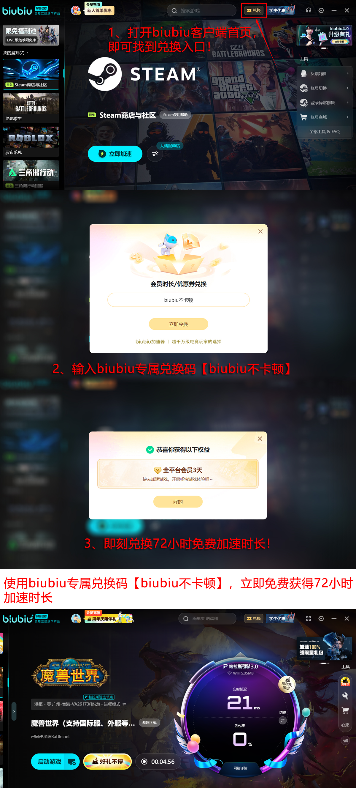 新用户可立即领取24小时免费加速时长,直观验证低延迟效果;所有用户输入兑换码【biubiu不卡顿】,还可额外获得3天连续加速权益。综合计算,新注册用户最高可享96小时免付费加速服务,充分满足开荒期高强度副本与跨服战役需求。